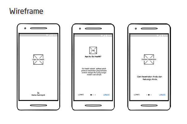 Pada tahapan sebelumnya kami sudah melakukan desain aplikasi menggunakan sketsa, kemudian kami mulai merancang desain wireframe. Wireframe adalah kerangka dasar halaman/screen yang akan kami buat untuk aplikasi Go-Health