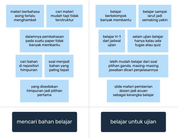 Wawancara dilakukan pada 2 target pengguna, yaitu mahasiswa aktif, serta pengurus himpunan bidang kepengerusan pengambangan ilmu pengetahuan. Kami memperloeh insight cukup menarik terkait dengan permasalahan belajar mahasiswa.